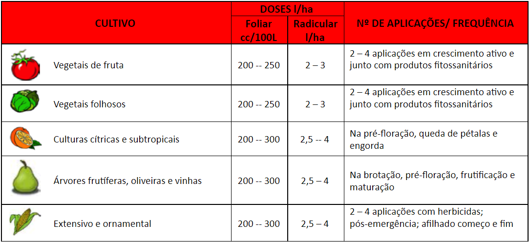 Aplicação de raiz e / ou foliar. Doses de aplicação geral: Foliar: 2 - 3 l / ha e aplicação. Aplique a cada 15 - 21 dias. Raiz: 2 - 4L / Ha e aplicação. Aplique a cada 15 - 21 dias.